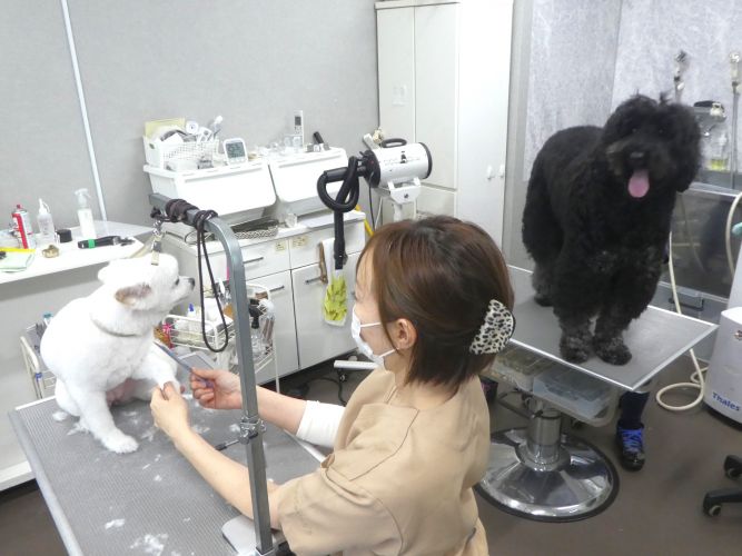 トリミング中はうとうとしていたみるくちゃんですが、お隣のテーブルに大きな体のスンクくんが来たらビビりまくり~!!