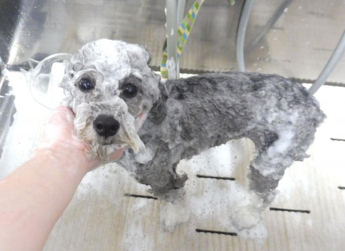 シャンプー中のラコくん!