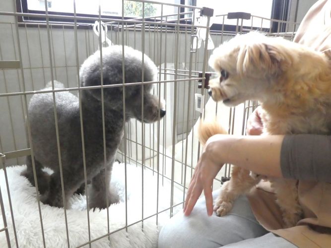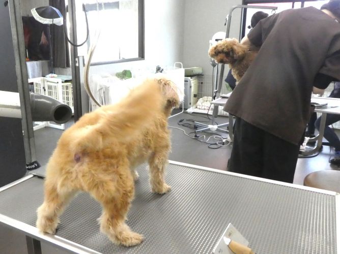 隣のトリミングテーブルに後から来たわんこさんにも、吠えようとスタンバイした所。。。