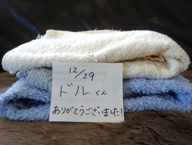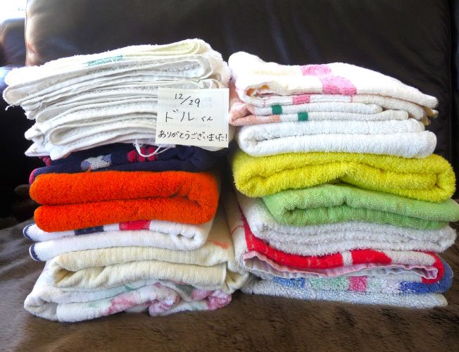 ・使い古しハンドタオル・フェイスタオル・バスタオル(シミや穴があっても洗濯してあれば大丈夫です。衛生環境を保つため消毒清掃や介護犬の敷物として日々大量に使用します。)