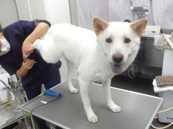 成犬になってから初めましてのサロンデビューは恐怖でいっぱいになってしまうコが多いので、精神的な負担を最小限にするために、1回目は全身のブラッシングと部分ケアなどでトリミングサロンに慣れる練習に来てもらっていました。