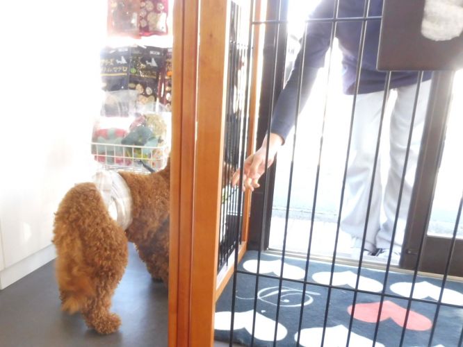スタッフがママのお見送りから戻ってきたのを喜んでいるテンくん!