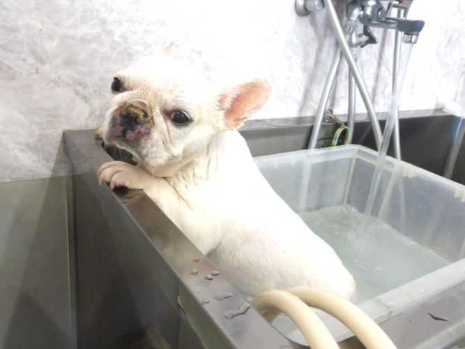 お顔を濡らされるのが苦手なハナちゃんの温浴スタイルです(笑)