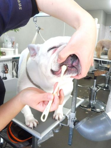 シャンプーブローが終わったら、肉厚の唇を上げて歯磨き!