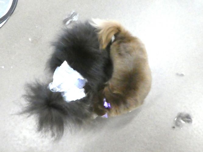 膝が弱いのと被毛が濡れると体が重くなるのとで、たろう君は、いつも濡らすと床にペッたり張り付くような姿勢になります。。。