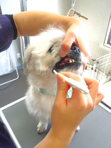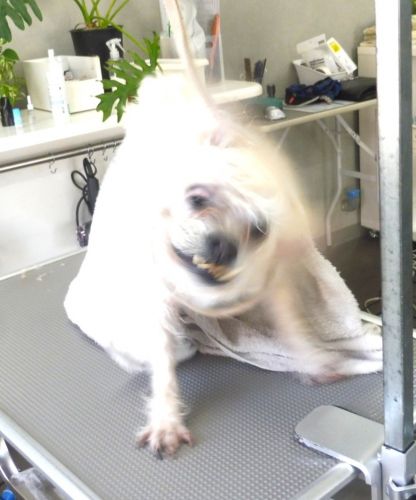 体が濡れているのが気持ち悪いようで、トリミング台に乗ってすぐぶるぶるしていました( *´艸`)
