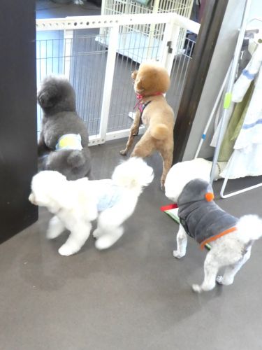 キレイキレイの後は、同じ時間にトリミングが終わった先輩たちと一緒に社会勉強!!