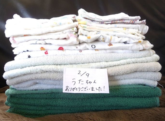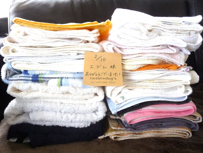 ・使い古しハンドタオル・フェイスタオル・バスタオル(シミや穴があっても洗濯してあれば大丈夫です。衛生環境を保つため消毒清掃や介護犬の敷物として日々大量に使用します。)