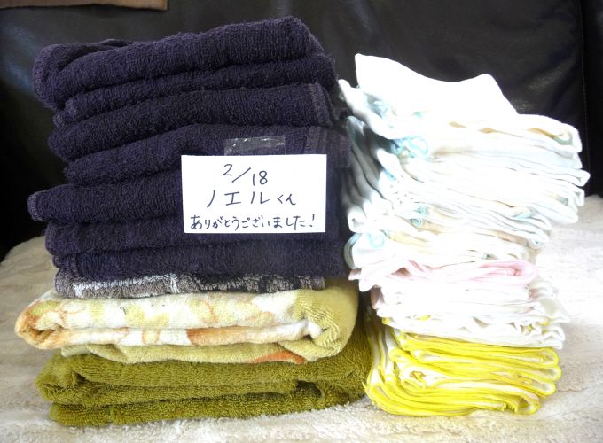 ・使い古しハンドタオル・フェイスタオル・バスタオル(シミや穴があっても洗濯してあれば大丈夫です。衛生環境を保つため消毒清掃や介護犬の敷物として日々大量に使用します。)