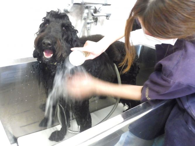 シャンプー前のすすぎはただ濡らすのではなく、被毛をかき分けながら地肌を洗うように行います☆