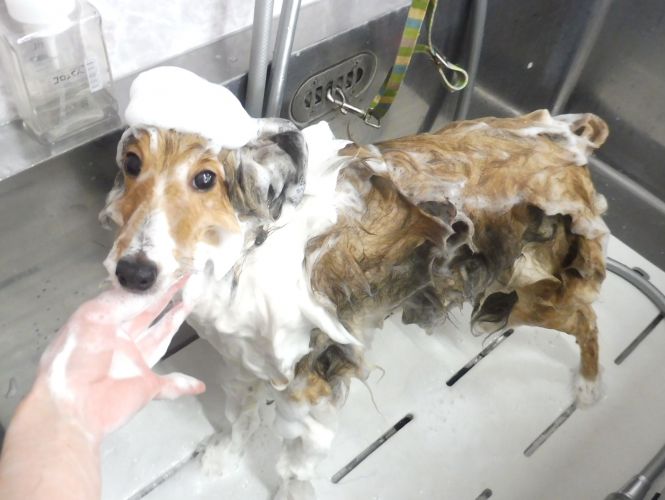 密な被毛で覆われて蒸れやすい皮膚は、雑菌による茶色い炎症ができやすいので念入りに洗っていきます☆