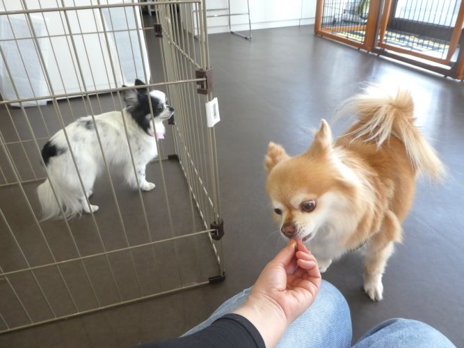 できるだけ他のワンコを避けて過ごしたいノエルくんでしたが、オヤツには抗えません!!