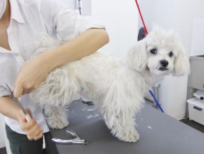まだ1歳にならないパピーちゃんですが、爪切りやバリカンの音にもあまり驚かず、