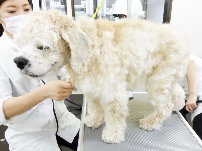 目が見えていないため、トリミング台からの落下には十分に気をつけて行わせていただきました!