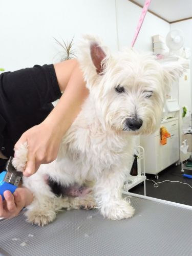トリミング台に乗ってもらって足裏バリカンと爪切り!