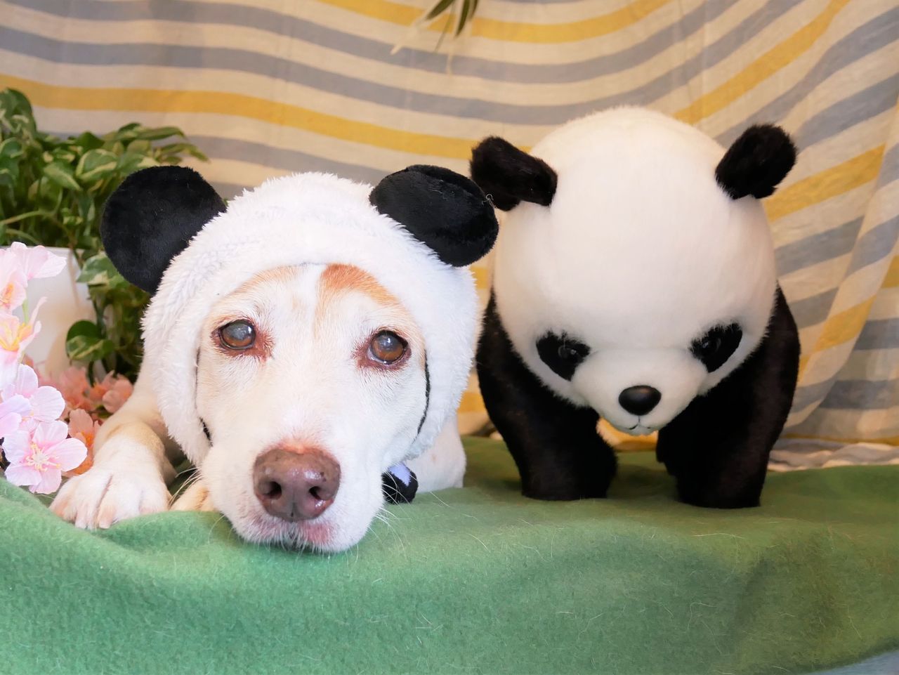 終わった後はパンダの被り物で仮装しました!ふわふわの布製で軽いのですが、小夏ちゃんに被せるとどんどん頭が下がってきて・・