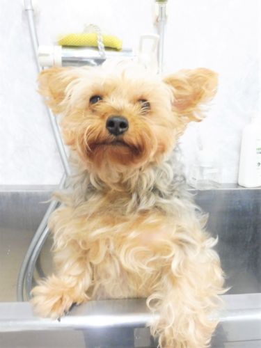 トリミングテーブルでは色んなことに興味津々で堂々としていましたが、囲まれた浴槽に入ったら急に緊張して出たがっていました☆