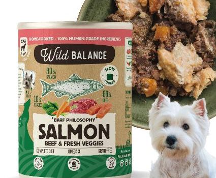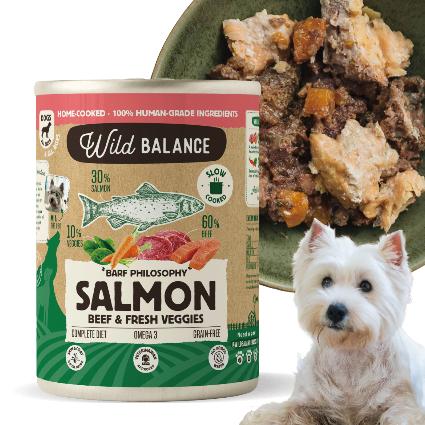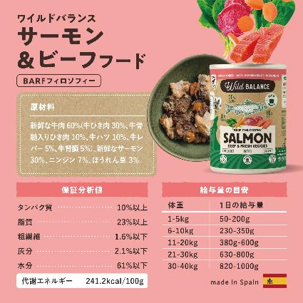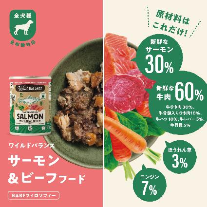 ワイルドバランス サーモン&ビーフフード BARFフィロソフィー缶は「犬本来の食性に近いレシピ」として、内臓を含む新鮮な牛肉とサーモン90%・野菜10%・穀類0%・添加物0%という割合で配合されています。